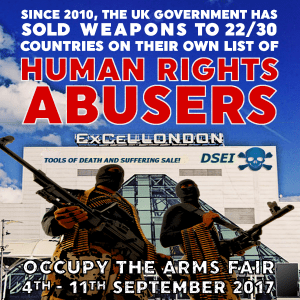 Join Occupy The Arms Fair‘s direct action camp to #StopDSEI, the world’s largest arms fair. 4th-11th September 2017, Excel Centre, London docklands.