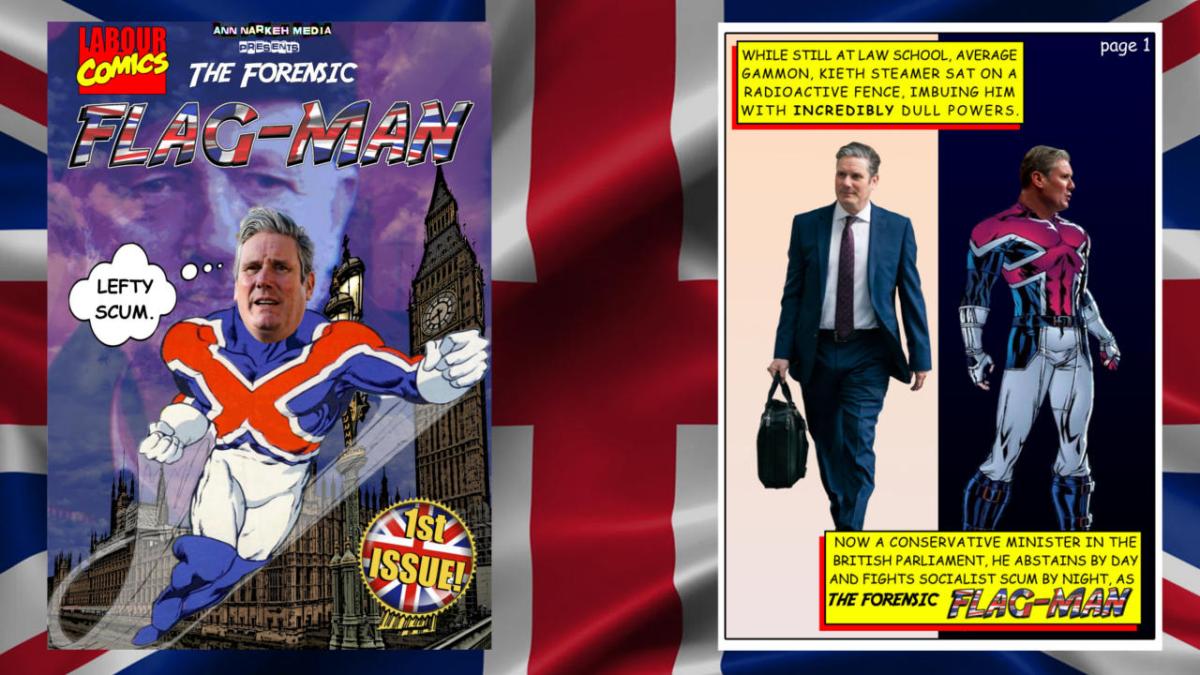 A FLAG-MAN™ comic book featuring Sir Kieth’s socialist arch-nemesis, Jimminy Crombob is also in development, according to a fictional leak from one of Sir Ken’s focus groups.